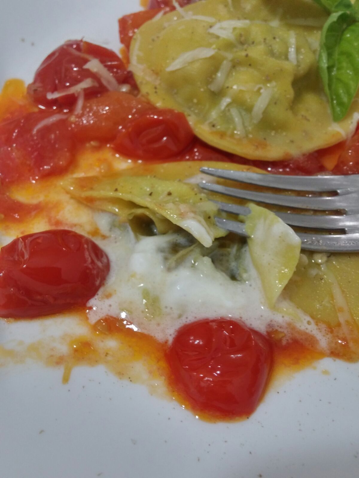Ravioli di curcuma ripieni di burrata e friggitelli su letto di pomodorini ciliegino